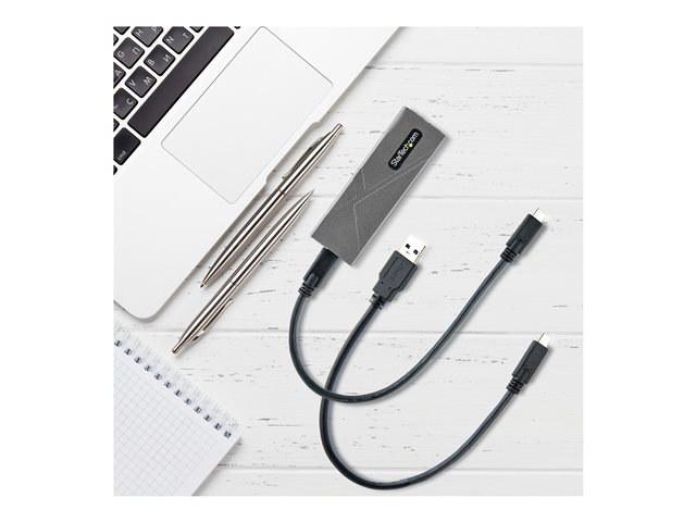 Produktbeskrivning StarTech.com USB-C 10Gbps to M.2 NVMe or M.2 SATA SSD Enclosure, Tool-free M.2 PCIe/SATA NGFF SSD Enclosure, Portable Aluminum Case, USB Type-C & USB-A Host Cables, For 2230/2242/2260/2280 - Works w/ Thunderbolt 3 (M2-USB-C-NVME-SATA) - förvaringslåda - M.2 Card (PCIe NVMe & SATA) - USB-C 3.2 (Gen 2) Typ av enhet Förvaringslåda - extern Busstyp USB-C 3.2 (Gen 2) Färg Rymdgrå Expansionsfack 1 x intern - M.2 NGFF 2230/2242/2260/2280 Formfaktorkomptibilitet för hårddisk M.2 Gränssnitt M.2 Card (PCIe NVMe & SATA) Dataöverföringshastighet 10 Gbit/s Enheter som stöds Halvledarenhet Max antal enheter 1 Produktmaterial Aluminium Strömkälla USB-buss Dimensioner (BxDxH) 10.5 cm x 3.5 cm x 1.4 cm Vikt 52 g - Tillbehör
