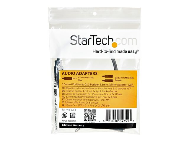 Produktbeskrivning StarTech.com 4 Position to 2x 3 Position 3.5mm Headset Splitter Adapter - headset-delare - 20 cm Kabel Headset-delare American Wire Gauge (AWG) 28 Kabellängd 20 cm Färg Svart Kontaktdon 4-poligt minijack - hane Kontakt (andra änden) 2 x minijack - hona Tillverkarens garanti Begränsad livstidsgaranti Designat för P/N: DK30A2DH, DK30CHDDPPD, DK30CHDPPDUE, MST30C2HDPPD, MUHSMF2M, USB3DDOCKFT, USB3DOCKHDPC, USB3SMDOCK4K, USB3VDOCK4DP, USB3VDOCKD - Tillbehör