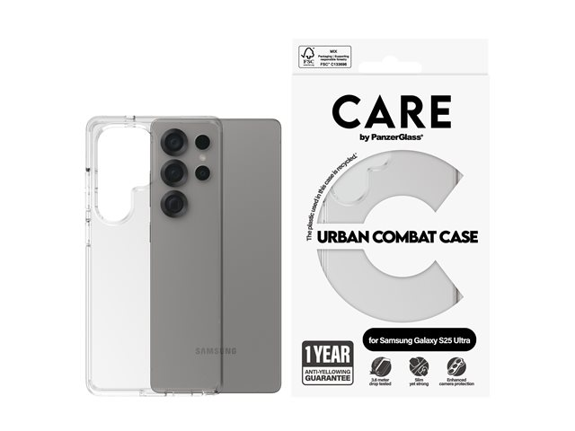 Produktbeskrivning CARE by PanzerGlass Urban Combat - baksidesskydd för mobiltelefon Typ av produkt Baksidesskydd för mobiltelefon Dimensioner (BxDxH) 8.4 cm x 1.3 cm x 16.8 cm Vikt 44 g Material Polykarbonat, termoplastisk polyuretan (TPU) Återvunnet produktinnehåll 100 % - tillverkat av återvunnet polykarbonat/termoplastpolyuretan (TPU) Designat för Samsung Galaxy S25 Ultra - Tillbehör