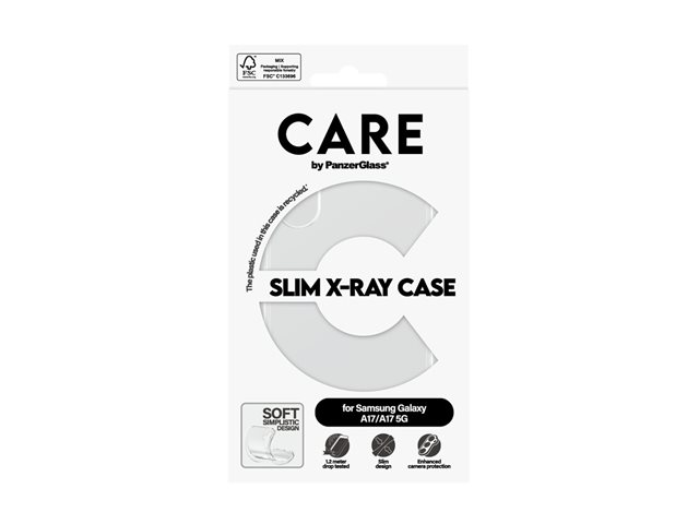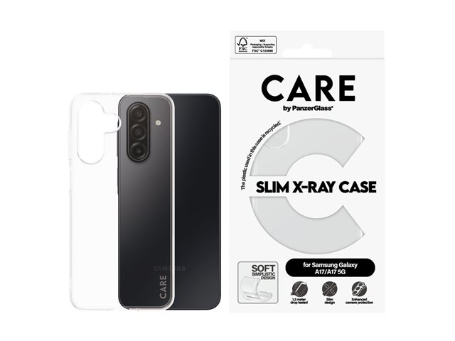 Produktbeskrivning CARE by PanzerGlass X-Ray - baksidesskydd för mobiltelefon Typ av produkt Baksidesskydd för mobiltelefon Dimensioner (BxDxH) 8.056 cm x 1.176 cm x 16.705 cm Vikt 27 g Material Termoplastisk polyuretan (TPU) Färg Transparent Återvunnet produktinnehåll 100 % - tillverkad av återvunnen plast Designat för Samsung Galaxy A17, A17 5G - Nedladdningsbara filer