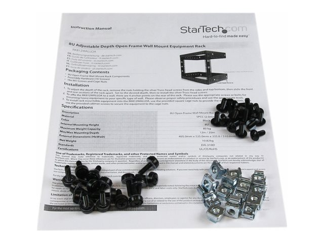 Produktbeskrivning StarTech.com 8U 19" Wall Mount Network Rack - 12" Deep 2 Post Open Frame Server Room Rack for Data/AV/IT/Computer Equipment/Patch Panel with Cage Nuts & Screws 135lb Capacity, Black (RK812WALLO) - rack - 8U Produkttyp Rack Färg Svart Stativstorlek 19" Höjd (U-format) 8U Produktmaterial Stål Dimensioner (BxDxH) 50.5 cm x 30.8 cm x 35.6 cm Vikt 8 kg Designat för P/N: CABCAGENUTS6, CABSCREWM5, CABSCREWM52, CABSCREWM6, CABSCREWM62, CABSCREWS, CABSCREWSM6, CABSCRWM520, CABSCRWM620, CABSCRWS1224 - Tillbehör