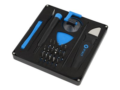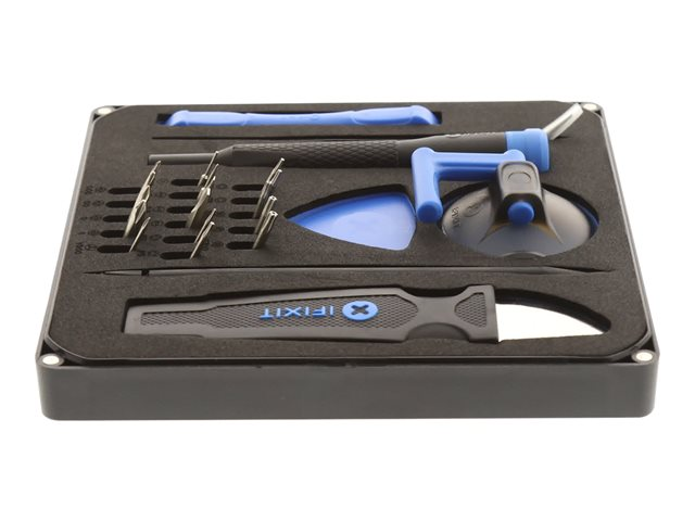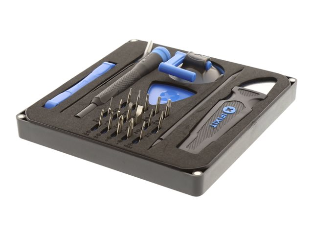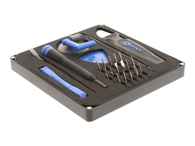 Förpackningsinnehåll 4 skruvmejselbits - kryssskruvar PH000, PH00, PH0, PH1, kabelverktyg, sugkopp, utmatningsverktyg för SIM-kort, öppningsverktyg, 6 öppningshackor, Jimmy öppningsverktyg, böjda pincetter, skruvmejselhandtag - 4 mm bituttag, 2 skruvmejselbitar - pentalob P2, P5, 3 skruvmejselbits - rak 1, 2,5, 4 mm, 2 mejselbits - vridmoment T4, T5, 3 skruvmejselbitar - sabotagefast torx TR6, TR8, TR10, skruvmejseldel - tripunkt Y000