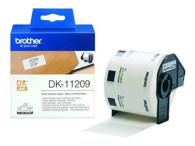 Produktbeskrivning Brother DK-11209 - adresslappar Typ av produkt Adresslappar Utskriftsteknik Direkttermo Mediefärger Svart på vitt Antal kort/etiketter per ark/rulle 800 Kompatibel med Brother QL-1050, QL-1050 TypeA, QL-1050N, QL-1060N, QL-1110NWBc, QL-500, QL-500A, QL-500A (50TH Year Anniversary Model), QL-500BS, QL-500BW, QL-550, QL-560, QL-560VP, QL-570, QL-580N, QL-600, QL-650TD, QL-700, QL-710W, QL-710WSP, QL-720NW, QL-820NW - Tillbehör