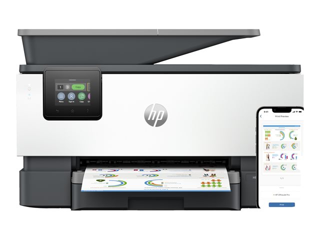 Produktbeskrivning HP Officejet Pro 9120b All-in-One - multifunktionsskrivare - färg Typ av enhet Multifunktionsskrivare Faxtyp Vanligt papper Lokalisering Bulgarien, Kroatien, Tjeckien, Grekland, Ungern, Polen, Rumänien, Slovakien, Slovenien Utskriftsteknik Bläckstråle (färg) Bläckstråleteknik HP Thermal Inkjet - 4-färgs Driftscykel per månad (max) 25000 sidor Rekommenderad månatlig volym 1500 sidor Max kopieringshastighet Upp till 19 sidor/minut (mono)/upp till 14 sidor/minut (färg) Max kopieringsupplösning Upp till 600 dpi (mono)/upp till 600 dpi (färg) Max utskriftshastighet Upp till 20 sidor/minut (mono)/upp till 16 sidor/minut (färg) Max utskriftsupplösning Upp till 1200 x 1200 dpi (mono)/upp till 4800 x 1200 dpi (färg) Max faxöverföringshastighet 33.6 Kbps Faxupplösningar 300 x 300 dpi, 200 x 200 dpi, 200 x 100 dpi Skanning 1200 x 1200 dpi Display 2.7" Originalstorlek 76.2 x 127 mm (min) - Legal (216 x 356 mm) (max) Originaltyp Ark Dokumentmatarens kapacitet 35 ark Mediastorlek 76.2 x 127 mm (min) - Legal (216 x 356 mm), A4 (210 x 297 mm) (max) Mediatyp Vanligt papper, fotopapper, tjockt papper, kortlager, glansigt papper, matt papper Standard mediekapacitet 250 ark Max mediekapacitet 250 ark Utmatningsfackens kapacitet 60 ark Automatisk duplex Ja (kopiering) Ja (utskrift) Ja (skannar) Anslutningsmöjlighet Ja Gränssnitt USB 2.0, LAN, Wi-Fi(n), USB-värd AirPrint-aktiverad Ja Kontorsmaskinfunktioner Skriv ut från USB Flash-enhet, skanna till e-post, inbäddad webbläsare, Mopria-certifierad, skanna till SharePoint, HP Auto-On/Auto-Off Technology, HP Instant Ink, IPP-utskrift, skanna till nätverksmappen Strömtillförsel Växelström 120/230 V (50/60Hz) Dimensioner (BxDxH) 43.93 cm x 34.25 cm x 27.8 cm Vikt 9.29 kg Tillverkarens garanti 1 års garanti - Tillbehör